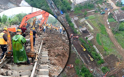 在塌陷路段現(xiàn)場,數(shù)量挖掘機(jī)首先將塌陷的鐵軌抬起,工人們將石料墊在鐵軌下。上千名鐵路工人連夜搶修,準(zhǔn)備了約3800立方米的石料對鐵軌做墊基加固。除了鐵路搶修,河岸護(hù)坡也要進(jìn)行加固,會在護(hù)坡上打入鋼板樁、填砂石料、澆灌混凝土等方式加固護(hù)坡。