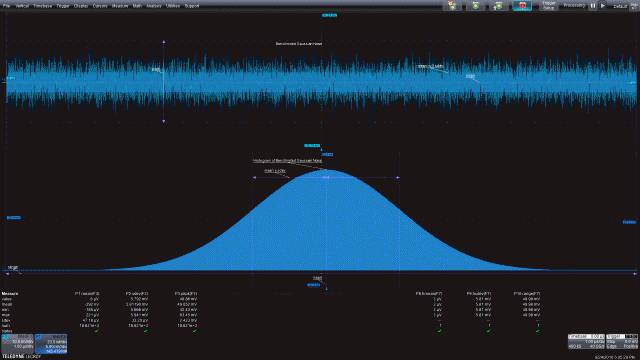顯示在圖1左上部分的曲線是帶寬受限的高斯噪聲的時(shí)域圖。我們在整篇文章中引用的都是這個(gè)信號(hào)。下面的曲線顯示的是頻域中的噪聲:信號(hào)的功率譜密度(PSD)顯示了每赫茲的噪聲功率與頻率的關(guān)系。右圖是帶寬受限噪聲的柱狀圖,通過近似隨機(jī)過程的概率密度函數(shù)(PDF)提供統(tǒng)計(jì)視圖。這些曲線的下方顯示了一系列的測量參數(shù),用于量化通過數(shù)學(xué)計(jì)算得到的波形。下面我們將詳細(xì)了解每種測量技術(shù),看看每種方法能夠呈現(xiàn)帶寬受限噪聲信號(hào)哪些內(nèi)容。