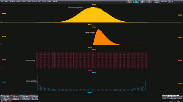 在許多應(yīng)用中,兩個(gè)或多個(gè)隨機(jī)過程可能發(fā)生交互。當(dāng)這種情況發(fā)生時(shí),過程的概率密度會(huì)進(jìn)行數(shù)學(xué)卷積運(yùn)算。一個(gè)常見的例子是結(jié)合了隨機(jī)和確定性抖動(dòng)分量的時(shí)序抖動(dòng)。圖5顯示了結(jié)合在一起的高斯和正弦分量,源分布位于上面兩張圖,從上往下數(shù)的第三張分布圖是兩個(gè)源卷積的結(jié)果。許多先進(jìn)的示波器提供可選的抖動(dòng)或噪聲分析包,這些分析包可以將這些組合式分布分開,單獨(dú)測量分量。