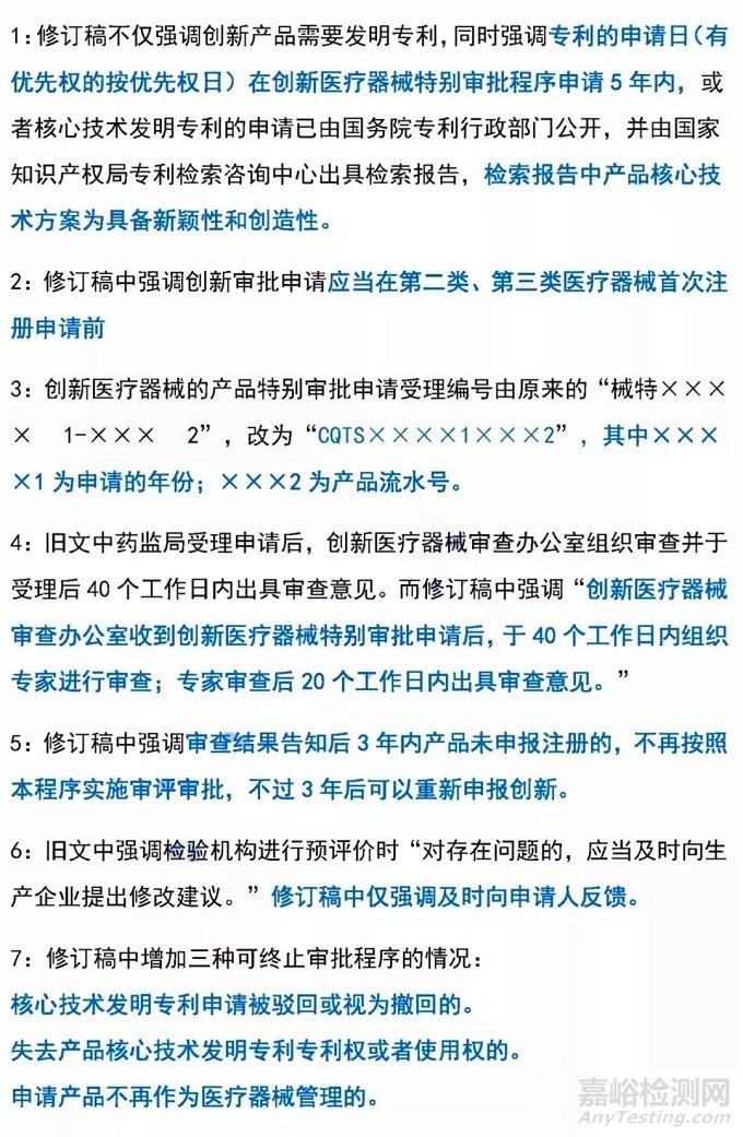 2018年5月7日,國家藥品監(jiān)督管理局發(fā)布《創(chuàng)新醫(yī)療器械特別審批程序(修訂稿征求意見稿)》,對比2014年2月7日印發(fā)的《創(chuàng)新醫(yī)療器械特別審批程序(試行)》,主要有以下七條變化: