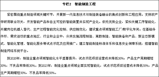 到2020年,基本實(shí)現(xiàn)工業(yè)化,制造業(yè)大國(guó)地位進(jìn)一步鞏固,制造業(yè)信息化水平大幅提升。掌握一批重點(diǎn)領(lǐng)域關(guān)鍵核心技術(shù),優(yōu)勢(shì)領(lǐng)域競(jìng)爭(zhēng)力進(jìn)一步增強(qiáng),產(chǎn)品質(zhì)量有較大提高。制造業(yè)數(shù)字化、網(wǎng)絡(luò)化、智能化取得明顯進(jìn)展。重點(diǎn)行業(yè)單位工業(yè)增加值能耗、物耗及污染物排放明顯下降。