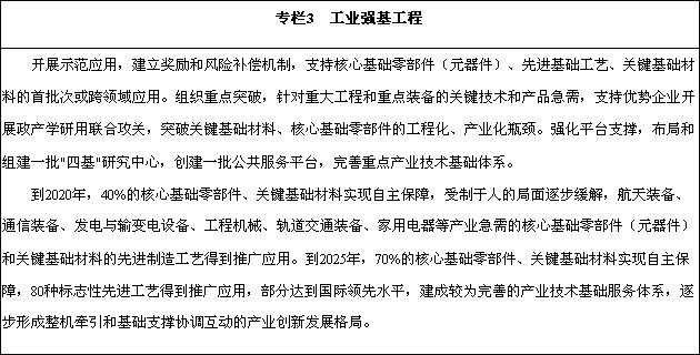 核心基礎(chǔ)零部件(元器件)、先進(jìn)基礎(chǔ)工藝、關(guān)鍵基礎(chǔ)材料和產(chǎn)業(yè)技術(shù)基礎(chǔ)(以下統(tǒng)稱(chēng)“四基”)等工業(yè)基礎(chǔ)能力薄弱,是制約我國(guó)制造業(yè)創(chuàng)新發(fā)展和質(zhì)量提升的癥結(jié)所在。要堅(jiān)持問(wèn)題導(dǎo)向、產(chǎn)需結(jié)合、協(xié)同創(chuàng)新、重點(diǎn)突破的原則,著力破解制約重點(diǎn)產(chǎn)業(yè)發(fā)展的瓶頸。