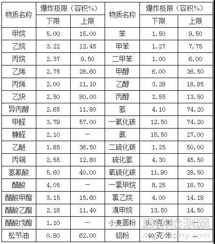 例如常見的VOC:苯,其與空氣混合的爆炸極限為1.5%~9.5%,前后兩個數(shù)字分別稱為爆炸下限和爆炸上限,這兩者有時亦稱為著火下限和著火上限。在低于爆炸下限時不爆炸也不著火;在高于爆炸上限時不會爆炸,但能燃燒。這是由于前者的可燃物濃度不夠,過量空氣的冷卻作用,阻止了火焰的蔓延;而后者則是空氣不足,導(dǎo)致火焰不能蔓延的緣故。常見物質(zhì)的爆炸極限如下,僅供參考: