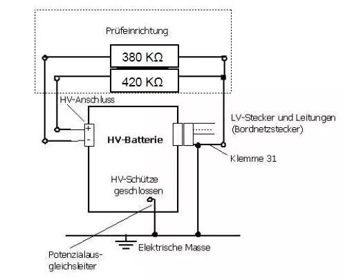 2. 在HV-與地之間連接第二個電阻,阻值380 kΩ,電池系統(tǒng)切換到運行狀態(tài), BMS識別到絕緣故障,HV+與地之間的絕緣電阻值=420kΩ5%,HV-與地之間的絕緣電阻值=380kΩ5%。