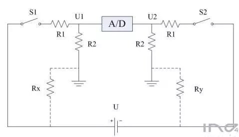 目前BMS主要采用國標推薦的測量方法,如圖1所示。Rx是HV+對地電阻,Ry是HV-對地電阻,R1,R2是測量用的已知阻值的標準電阻,測量方法如下: