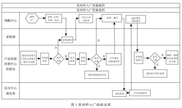 流程(Process),也譯為過程,是“工作流轉(zhuǎn)的過程”的簡稱。這些工作需要多個(gè)部門、多個(gè)崗位的參與和配合,這些部門、崗位之間會(huì)有工作的承接、流轉(zhuǎn),因此流程也可以說是“跨部門、跨崗位工作的過程”。流程本身是業(yè)務(wù)動(dòng)作的載體,它是現(xiàn)代企業(yè)管理研究的重點(diǎn)內(nèi)容之一,如圖1所示為某企業(yè)原材料入廠檢驗(yàn)流程,此業(yè)務(wù)流程4個(gè)不同職能部門,部門之間有分工有協(xié)作,按此流程圖可有效完成原材料入廠檢驗(yàn)工作。但并不是企業(yè)的所有業(yè)務(wù)工作都是有流程圖作指導(dǎo)的,各部門是根據(jù)各自的職責(zé)分工完成相應(yīng)工作,當(dāng)某項(xiàng)工作內(nèi)容在流程中職責(zé)分工不明確時(shí),會(huì)使整個(gè)流程中斷或無法實(shí)現(xiàn)業(yè)務(wù)增值的目的,這就會(huì)產(chǎn)生質(zhì)量風(fēng)險(xiǎn)。