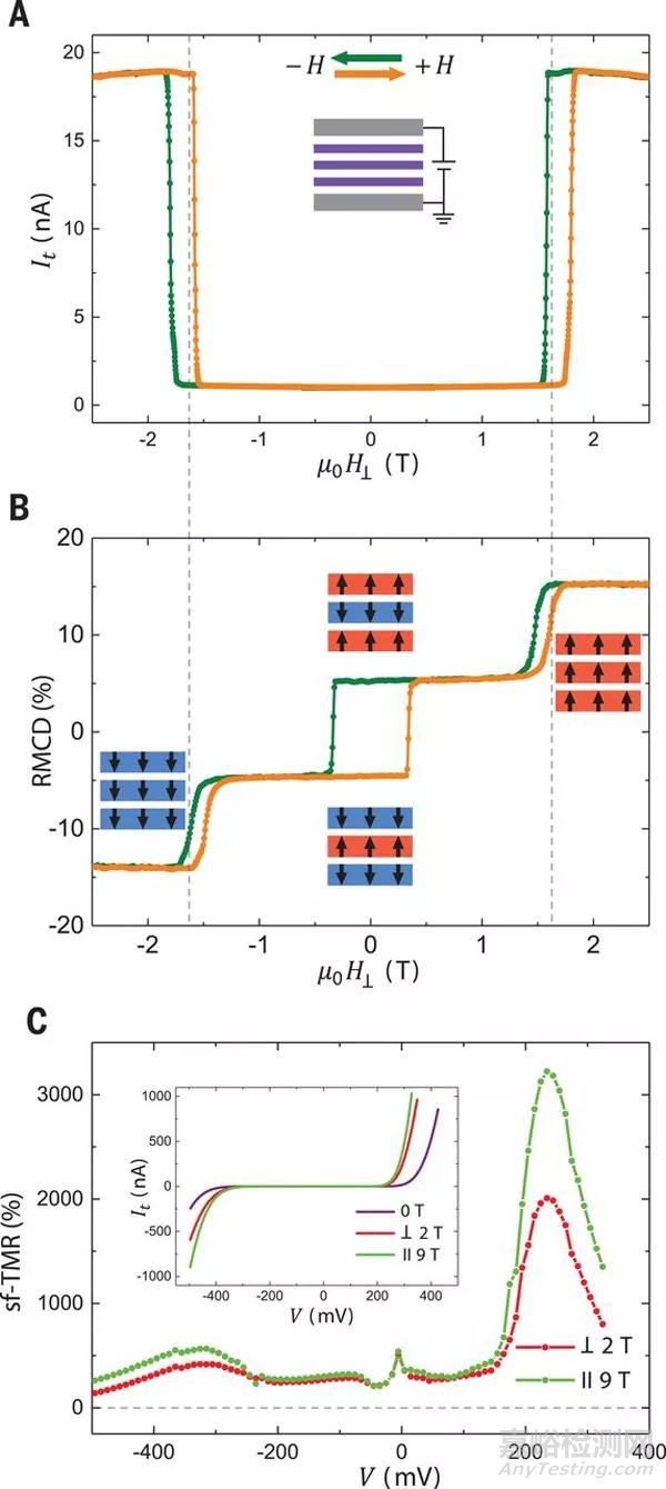 許多二維(2D)材料可以結(jié)合到人造異質(zhì)結(jié)構(gòu)中,其中之一是磁性絕緣體三碘化鉻(CrI3),具有雙層形式的分層反鐵磁基態(tài)。磁光克爾效應(yīng)(MOKE)測量表明,自旋在各層內(nèi)鐵磁性排列在平面外,但在層間具有反鐵磁性,導(dǎo)致凈磁化強度消失。這種分層反鐵磁有序使得CrI3有利于實現(xiàn)原子級薄磁多層器件。與現(xiàn)有磁性多層器件相比,雙層CrI3中的層狀反鐵磁結(jié)構(gòu)避免了制造具有間隔物的單獨的自旋濾波器的需要。這保證了旋轉(zhuǎn)濾波器之間尖銳的原子接口,這對實現(xiàn)大的雙自旋過濾磁隧道結(jié)(sf-TMR)至關(guān)重要。