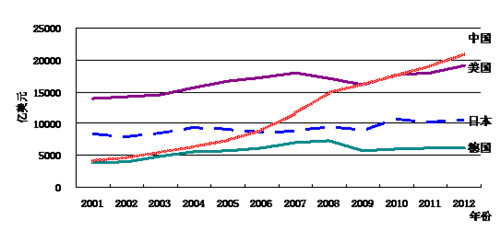 圖1 2001—2012年四國(guó)制造業(yè)增加值變化曲線
