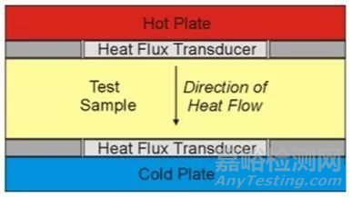即通常所說的穩(wěn)態(tài)熱流法,測試原理是將厚度一定的樣品置于兩個平板間,對樣品施加一定的熱流量和壓力,使用校正過的熱流傳感器測量通過樣品的熱流,測試樣品的厚度、熱板/冷板間的溫度梯度,然后根據(jù)不同厚度下對應的熱流量數(shù)據(jù)作直線擬合得出樣品的導熱系數(shù)。