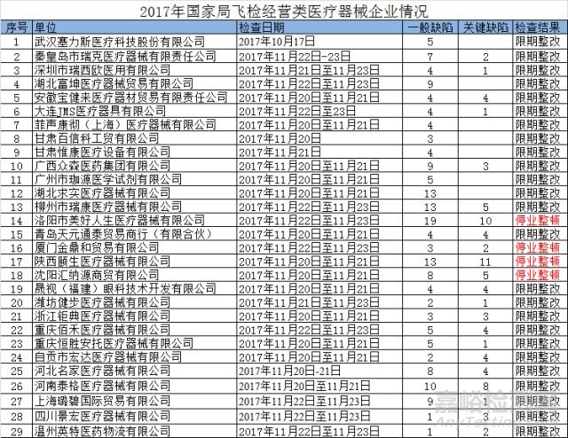 2017年國(guó)家局29家經(jīng)營(yíng)類醫(yī)療器械企業(yè)進(jìn)行飛檢,具體情況如下: