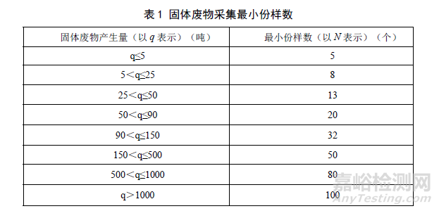 4.2.2 固體廢物為歷史遺留固體廢物時(shí),若采集可類比工藝產(chǎn)生的固體廢物,則依據(jù)可類比工藝的固體廢物產(chǎn)生量按照表1 確定需要采集的最小份樣數(shù);若采集歷史遺留固體廢物,應(yīng)以遺留的固體廢物總量為依據(jù),按照表1 確定需要采集的最小份樣數(shù)。