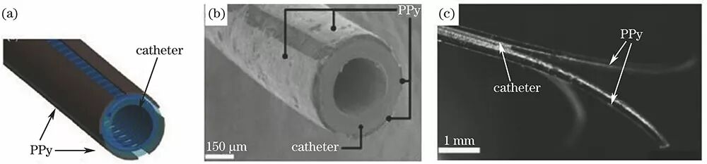 圖 激光微加工制備的PPy基主動(dòng)導(dǎo)管。(a) 四電極導(dǎo)管設(shè)計(jì)結(jié)構(gòu); (b) 激光微加工技術(shù)制備的四電極導(dǎo)管掃描電鏡圖; (c) 導(dǎo)管一端的PPy彎曲運(yùn)動(dòng)