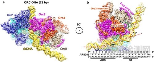 2018年7月4日,結(jié)合有復(fù)制起點DNA(ARS305)的釀酒酵母起點識別復(fù)合物(ORC)3-Å分辨率的冷凍電鏡結(jié)構(gòu)。此高分辨率結(jié)構(gòu)不僅為理解酵母ORC如何識別和結(jié)合序列特異性的DNA復(fù)制起點提供了分子基礎(chǔ),同時也闡明了ORC如何通過彎曲DNA來進一步加載DNA復(fù)制解旋酶MCM2-7的分子過程。