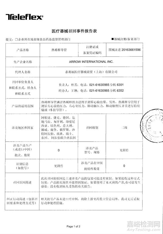 泰利福醫(yī)療器械商貿(mào)(上海)有限公司報(bào)告,由于產(chǎn)品的包裝可能沒有密封,生產(chǎn)商ARROW INTERNATIONAL INC.對熱稀釋導(dǎo)管(注冊證編號:國械注進(jìn)20163661596)主動召回。召回級別為三級。涉及產(chǎn)品的型號、規(guī)格及批次等詳細(xì)信息見《醫(yī)療器械召回事件報(bào)告表》。