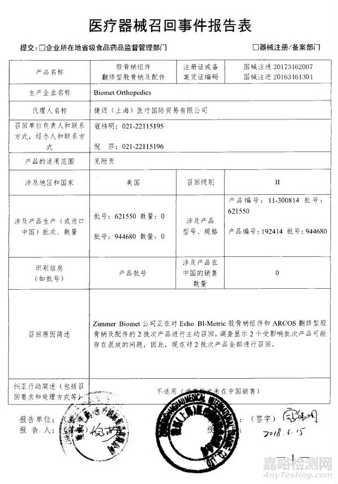 捷邁(上海)醫(yī)療國際貿(mào)易有限公司報(bào)告,由于受影響批次產(chǎn)品可能存在混放的問題,生產(chǎn)商Biomet Orthopedics對股骨柄組件(注冊證編號:國械注進(jìn)20173462007)、翻修型股骨柄及配件(注冊證編號:國械注進(jìn)20163461304)主動召回。召回級別為二級。涉及產(chǎn)品的型號、規(guī)格及批次等詳細(xì)信息見《醫(yī)療器械召回事件報(bào)告表》。