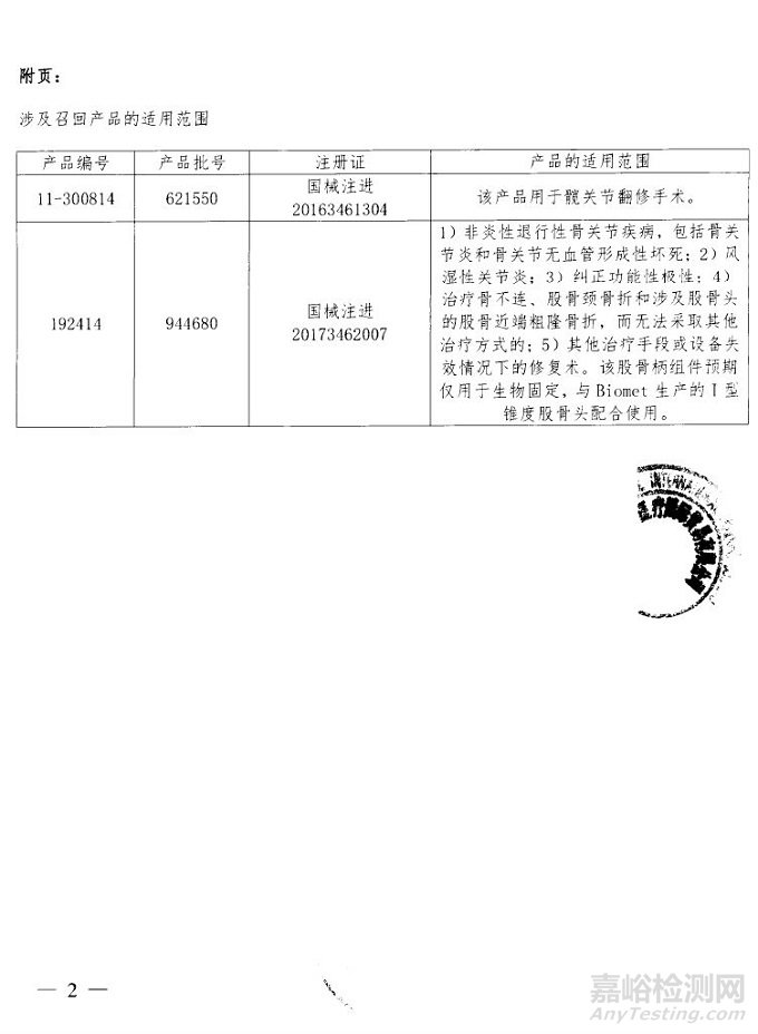 Biomet Orthopedics對股骨柄組件和翻修型股骨柄及配件主動召回