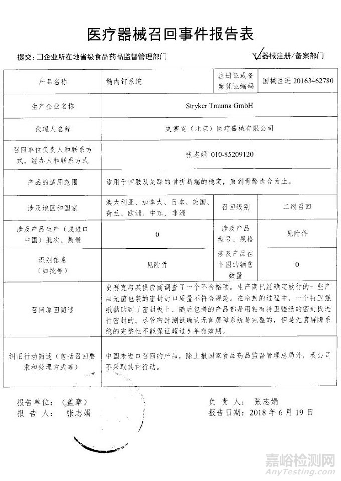 Stryker Trauma GmbH對髓內(nèi)釘系統(tǒng)主動召回