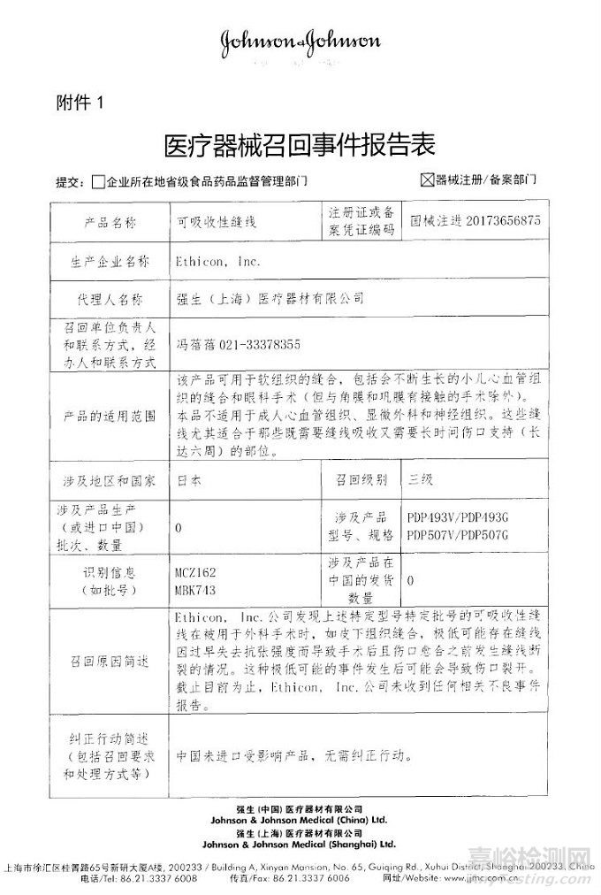 強(qiáng)生(上海)醫(yī)療器材有限公司報(bào)告,由于產(chǎn)品在被用于外科手術(shù)時(shí)極低可能存在縫線因過早失去抗張而導(dǎo)致手術(shù)后且傷口愈合之前發(fā)生縫線斷裂的情況,生產(chǎn)商Ethicon, Inc.對可吸收性縫線(注冊證編號:國械注進(jìn)20173656875)主動召回。召回級別為三級。涉及產(chǎn)品的型號、規(guī)格及批次等詳細(xì)信息見《醫(yī)療器械召回事件報(bào)告表》。