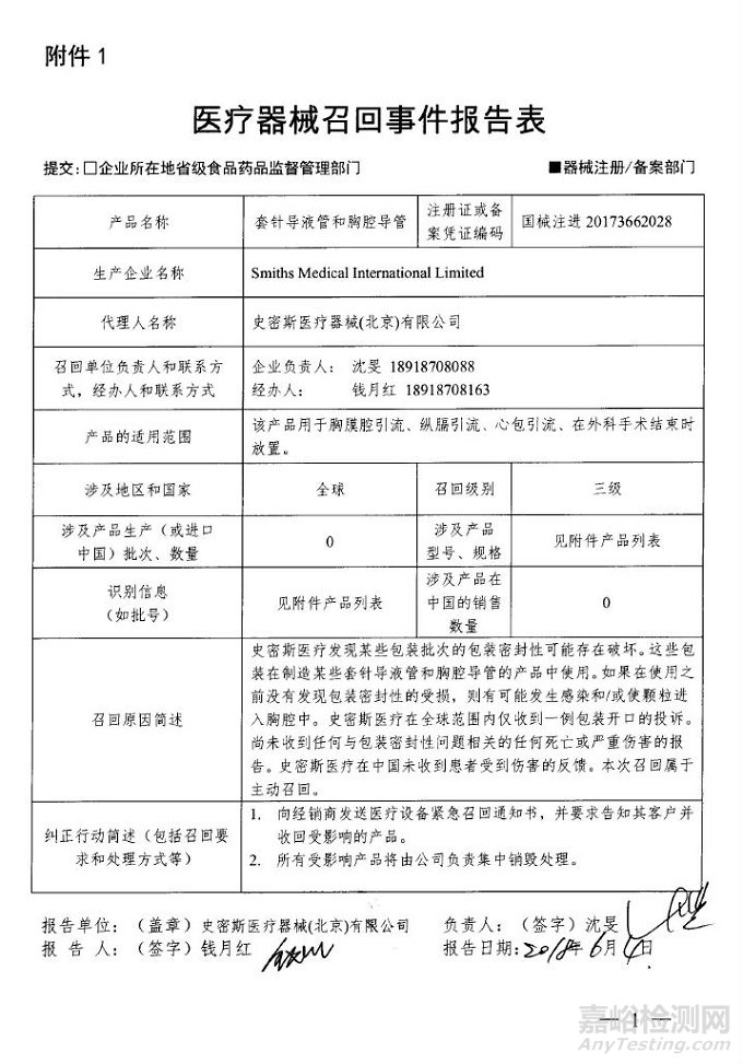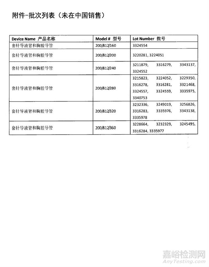 Smiths Medical International Limited對套針導(dǎo)液管和胸腔導(dǎo)管主動召回