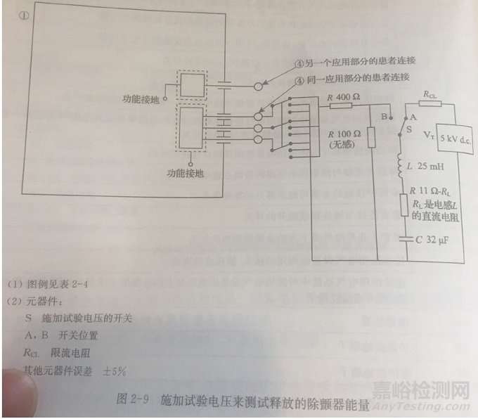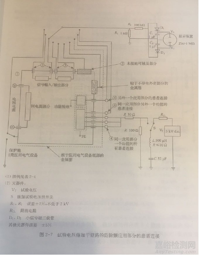 ME設(shè)備接至如圖2-8所示的試驗電路。試驗電壓輪流施加防除顫運(yùn)用部分的每個患者連接,該運(yùn)用部分的所有其他患者連接接地。注:當(dāng)應(yīng)用部分只有一個患者連接時,不采用差模試驗。