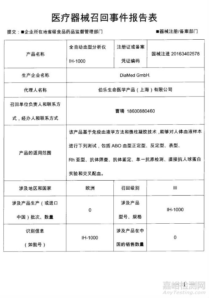 伯樂生命醫(yī)學(xué)產(chǎn)品(上海)有限公司報(bào)告,由于發(fā)現(xiàn)將條形碼無法讀取的試劑裝載到安裝有軟件04.07.02版本的全自動血型分析儀時,第一種試劑可以按照要求加樣,但不需要加樣的其他所有孔也會被全部加樣,生產(chǎn)商DiaMed GmbH.對全自動血型分析儀IH-1000(注冊證編號:國械注進(jìn)20163402578)主動召回。召回級別為三級。涉及產(chǎn)品的型號、規(guī)格及批次等詳細(xì)信息見《醫(yī)療器械召回事件報(bào)告表》。