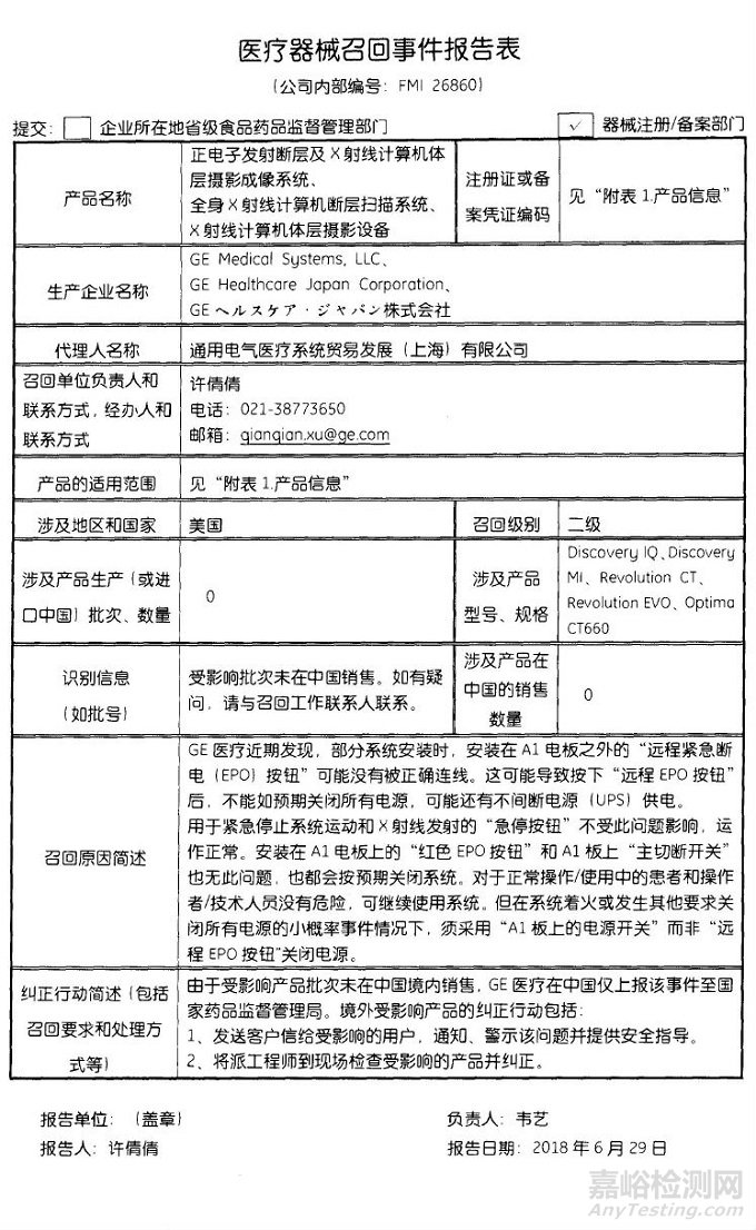 通用電氣醫(yī)療系統(tǒng)貿(mào)易發(fā)展(上海)有限公司對正電子發(fā)射斷層及X射線計(jì)算機(jī)體層攝影成像系統(tǒng)等主動召回