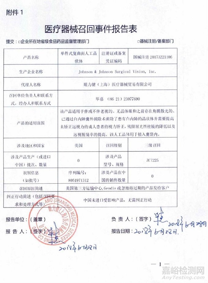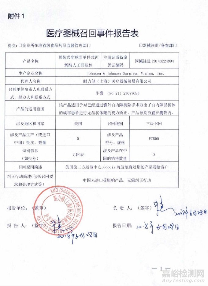 眼力健(上海)醫(yī)療器械貿(mào)易有限公司報(bào)告,由于第三方運(yùn)輸中心將過期的產(chǎn)品發(fā)給客戶,生產(chǎn)商Johnson & Johnson Surgical Vision, Inc.對單件式復(fù)曲面人工晶狀體(注冊證編號:國械注進(jìn)20173221106)主動召回。召回級別為三級。涉及產(chǎn)品的型號、規(guī)格及批次等詳細(xì)信息見《醫(yī)療器械召回事件報(bào)告表》。