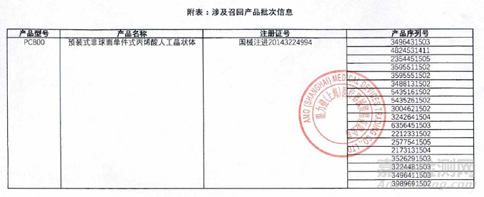 眼力健(上海)醫(yī)療器械貿(mào)易有限公司報(bào)告,由于第三方運(yùn)輸中心將過期的產(chǎn)品發(fā)給客戶,生產(chǎn)商Johnson & Johnson Surgical Vision, Inc.對預(yù)裝式非球面單件式丙烯酸人工晶狀體(注冊證編號:國械注進(jìn)20143224994)主動召回。召回級別為三級。涉及產(chǎn)品的型號、規(guī)格及批次等詳細(xì)信息見《醫(yī)療器械召回事件報(bào)告表》。