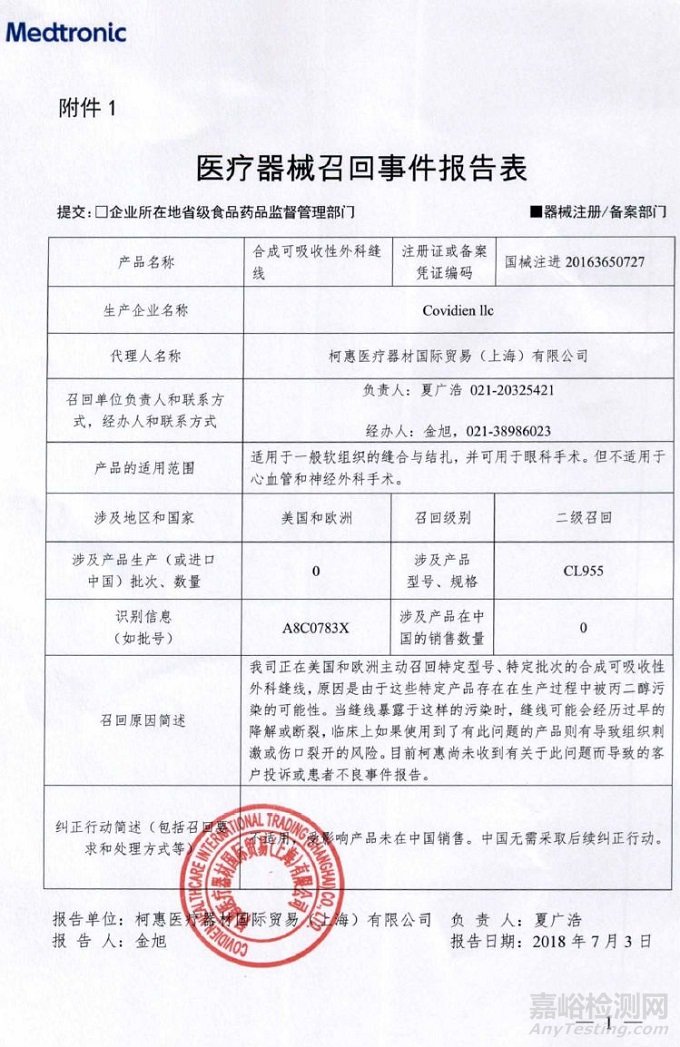 柯惠醫(yī)療器材國際貿(mào)易(上海)有限公司報(bào)告,由于產(chǎn)品存在生產(chǎn)過程中被丙二醇污染的可能性,生產(chǎn)商Covidien llc對合成可吸收性外科縫線(注冊證編號:國械注進(jìn)20163650727)主動召回。召回級別為二級。涉及產(chǎn)品的型號、規(guī)格及批次等詳細(xì)信息見《醫(yī)療器械召回事件報(bào)告表》。