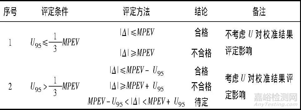 (2) 校準(zhǔn)證書合格評定:凡依據(jù)國家計(jì)量校準(zhǔn)規(guī)范, 或非強(qiáng)制檢定計(jì)量器具依據(jù)計(jì)量檢定規(guī)程的相關(guān)部分, 或依據(jù)其他以確認(rèn)的校準(zhǔn)方法出具的校準(zhǔn)證書, 一般不判斷計(jì)量器具合格與否。主要根據(jù)雙方約定的技術(shù)文件出具測量標(biāo)準(zhǔn)提供的量值與相應(yīng)示值之間的關(guān)系, 并給出相應(yīng)的測量結(jié)果的不確定度??蛻臬@取校準(zhǔn)證書后需要對示值誤差是否符合最大允許誤差要求做出符合性判定。但是按照J(rèn)JF1094-2002《測量儀器特性評定》的規(guī)定, 當(dāng)示值誤差的測量不確定度U95或k=2時(shí)的U) 與被評定測量儀器的最大允許誤差的絕對值 (MPEV) 之比不滿足小于或等于1∶3, 即滿