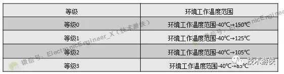 AEC-Q100-H版相比E版、G版取消了等級(jí)4(等級(jí)4:環(huán)境工作溫度范圍0℃-+70℃),環(huán)境工作溫度范圍見表1所示。