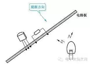 ?。?)在觀察電路板上元器件與銅箔線(xiàn)路的連接情況、觀察銅箔線(xiàn)路走向時(shí),可以用燈照著。如圖15所示,將燈放置在有銅箔線(xiàn)路的一面,在裝有元器件的一面可以清晰、方便地觀察到銅箔線(xiàn)路與各元器件的連接情況,這樣可以省去電路板的翻轉(zhuǎn)。因?yàn)椴粩喾D(zhuǎn)電路板不但麻煩,而且容易折斷電路板上的引線(xiàn)。