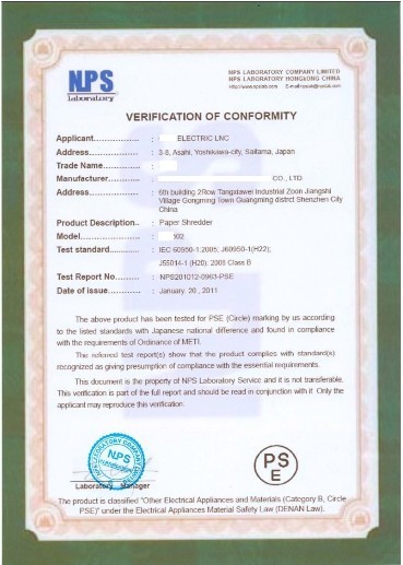 六、PSE認(rèn)證證書(shū)樣板