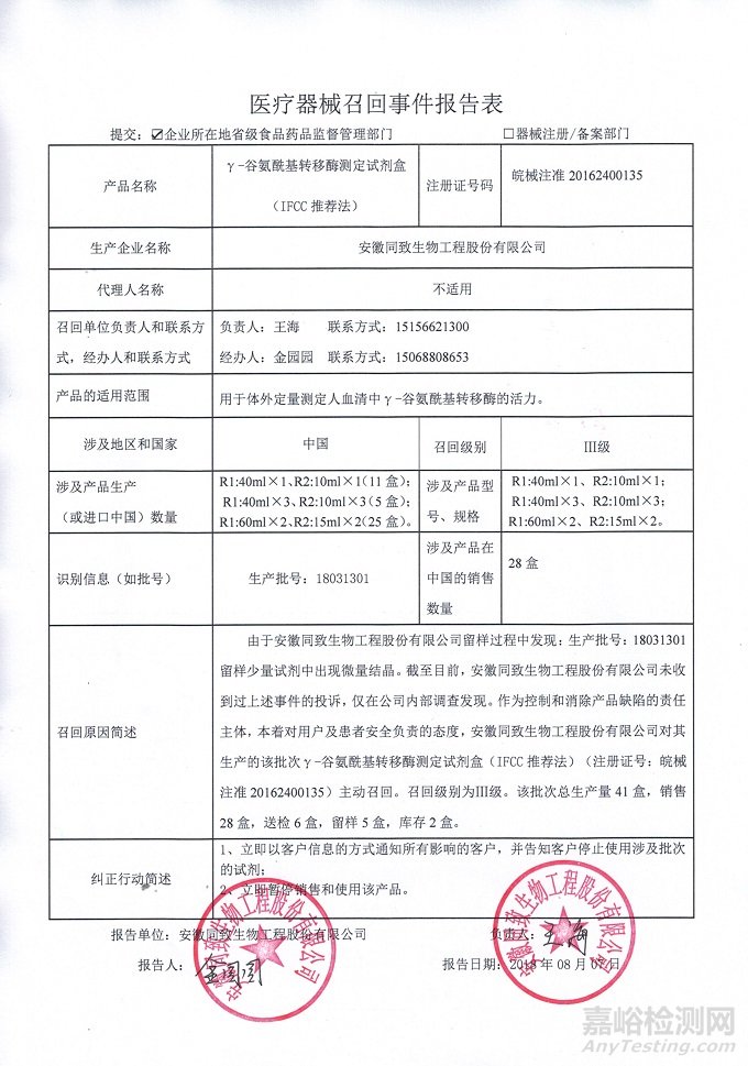 安徽同致生物工程股份有限公司報(bào)告,由于安徽同致生物工程股份有限公司在試劑留樣過(guò)程中發(fā)現(xiàn):隨著留樣時(shí)間增加,生產(chǎn)批號(hào):18031301留樣少量試劑中出現(xiàn)微量結(jié)晶。截止目前,安徽同致生物工程股份有限公司未收到過(guò)上述事件的投訴,僅在公司內(nèi)部調(diào)查時(shí)發(fā)現(xiàn)。作為控制和消除產(chǎn)品缺陷的責(zé)任主體,本著對(duì)用戶(hù)及患者安全負(fù)責(zé)的態(tài)度,安徽同致生物工程股份有限公司對(duì)其生產(chǎn)的該批次γ-谷氨酰基轉(zhuǎn)移酶測(cè)定試劑盒(IFCC推薦法)(注冊(cè)證號(hào):皖械注準(zhǔn)20162400135)主動(dòng)召回,召回級(jí)別為III級(jí)。涉及產(chǎn)品的型號(hào)、規(guī)格及批次等詳細(xì)信息見(jiàn)《醫(yī)療器械召回事件報(bào)告表》。