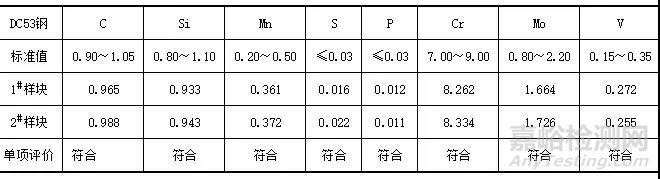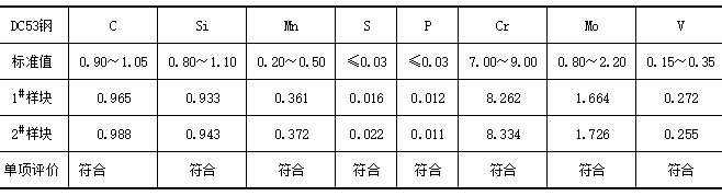從兩件模具失效件上分別截取樣塊,尺寸為長(zhǎng)25mm×寬25mm×厚15mm,進(jìn)行化學(xué)成分檢測(cè),檢測(cè)設(shè)備為SFECTRO MAXX火花直讀發(fā)射光譜儀。檢查結(jié)果表明,化學(xué)成分符合DC53鋼的標(biāo)準(zhǔn)要求(見表2)。