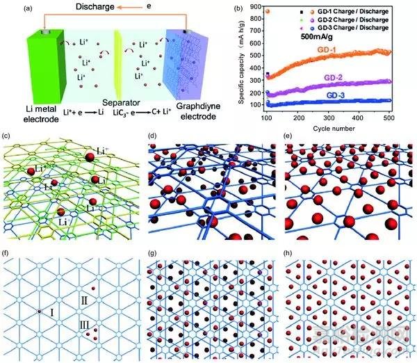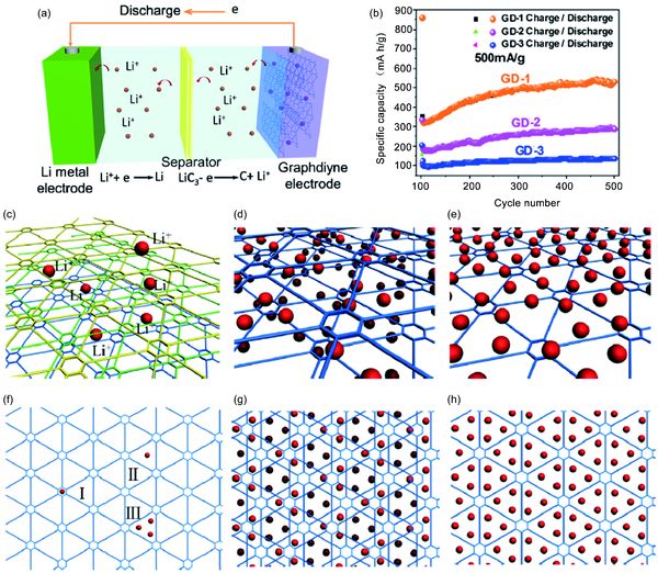 石墨炔的優(yōu)勢非常明顯,應(yīng)用也很廣泛。貴金屬催化劑(如Pt,Ir,Pd)被認(rèn)為是最先進(jìn)的電催化劑,它們的高成本,稀缺性,穩(wěn)定性差。雖然碳材料的結(jié)構(gòu)由于其可調(diào)節(jié)的分子結(jié)構(gòu),但低電導(dǎo)率和有限暴露的活性位點在催化上顯得并不是很理想。石墨炔上的一些碳原子具有凈正電荷,這些帶正電荷的位點可以改善石墨炔與氣體之間的相互作用并促進(jìn)電催化過程。此外,由于石墨炔中苯環(huán)之間的額外炔烴單元,網(wǎng)絡(luò)的孔徑增加至約2.5埃,這有利于當(dāng)暴露于大氣時空氣吸附到孔隙中。近年研究的熱電鋰電池也被加入石墨做成了商業(yè)化負(fù)極,但是372 mA h/g的低儲存容量是一大限制。理論結(jié)果表明,石墨炔(GDY)的實際比容量/體積容量(α-GDY為2719mA h/g,γ-GDY為744 mA h/g)。GDY單分子層中Li的能量學(xué)和動力學(xué)證明GDY能夠在具有中等勢壘(0.35-0.52eV)的Li離子的面內(nèi)和面外擴(kuò)散,這表明GDY可以作為優(yōu)異的鋰離子電池負(fù)極。此外,石墨炔在光電探測器、超級電容器、太陽能電池、光催化水分解等方面也有著很多優(yōu)異的性能。