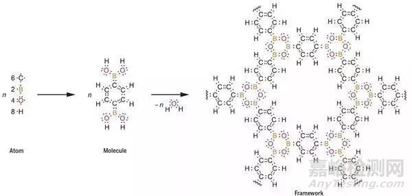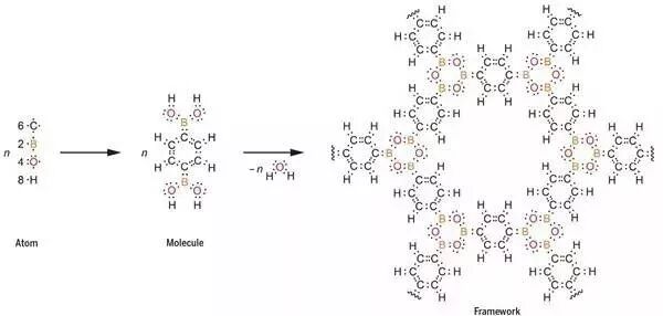 網(wǎng)狀COFs的一般合成路線如下:第一,目標(biāo)網(wǎng)絡(luò)拓?fù)浣Y(jié)構(gòu)的確定及其基本幾何單元的解構(gòu);第二,評估組成部分的延展性(連通性)和幾何外形;第三,尋找與幾何單元相當(dāng)?shù)姆肿硬⑵渥鳛檫B接物;第四,通過連接物間強(qiáng)烈的共價鍵形成COFs;第五,如果產(chǎn)物本身是單晶的,那么它就可以使用X射線或者電子衍射進(jìn)行表征。截止目前,已經(jīng)有超過100種COFs結(jié)構(gòu)被報道,這些結(jié)構(gòu)中都至少由兩種派生物組成。在這些COFs中,都是由上述的這五個步驟進(jìn)行合成的。