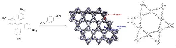 2014年,中國科學(xué)院上海有機(jī)化學(xué)研究所有機(jī)功能分子合成與組裝化學(xué)院重點實驗室趙新課題組選定特定的D2h和C2對稱性的單體聚合,首次成功制備了同時具有兩種不同孔結(jié)構(gòu)(三角形微孔和六邊形介孔)的二維共價有機(jī)框架。