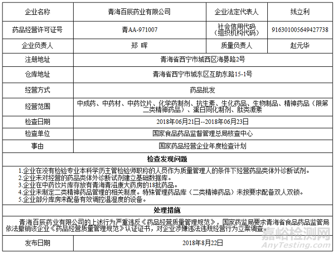對青海百辰藥業(yè)有限公司飛行檢查通報