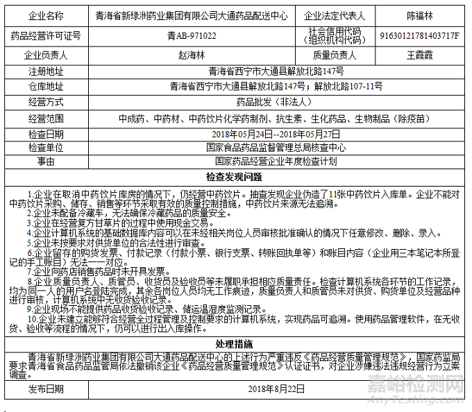 對青海省新綠洲藥業(yè)集團有限公司大通藥品配送中心飛行檢查通報