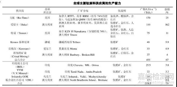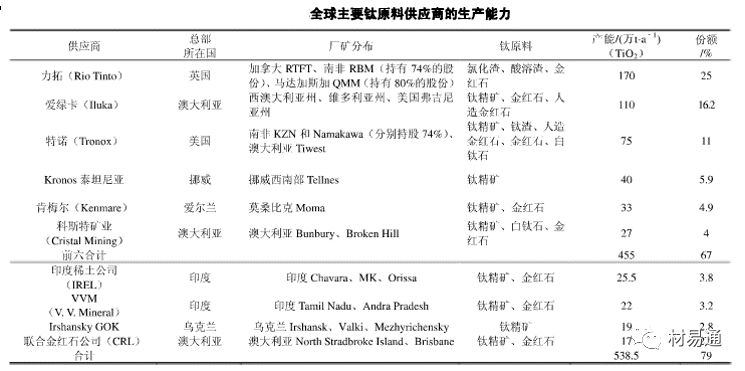 表2 2011年全球主要鈦原料供應(yīng)商的生產(chǎn)能力