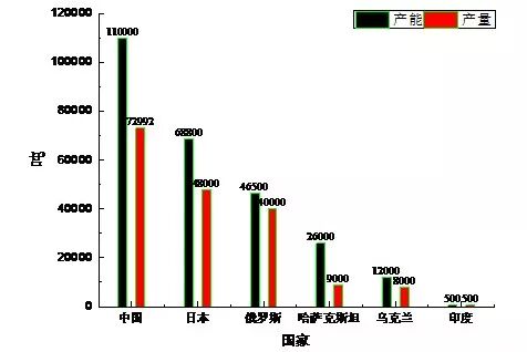 圖6 2017年全球海綿鈦產(chǎn)能與產(chǎn)量