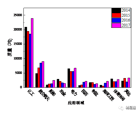 圖12 2014~2017 年中國各應(yīng)用領(lǐng)域鈦加工材使用量
