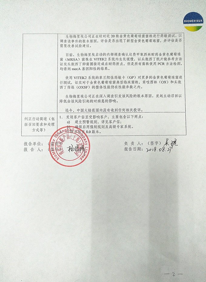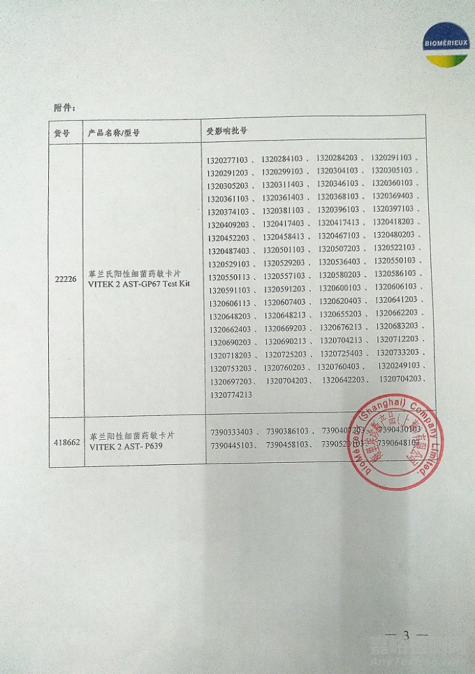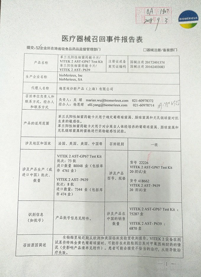 梅里埃診斷產(chǎn)品(上海)有限公司報(bào)告,由于VITEK2設(shè)備在測(cè)試某些特殊金黃色葡萄球菌時(shí),可能存在未能檢測(cè)出其對(duì)甲氧西林耐藥的情況。生產(chǎn)商bioMerieux,Inc, bioMerieux,SA對(duì)革蘭氏陽(yáng)性細(xì)菌藥敏卡片、革蘭陽(yáng)性細(xì)菌藥敏卡片(注冊(cè)證編號(hào):國(guó)械注進(jìn)20172401374,國(guó)械注進(jìn)20162403083)主動(dòng)召回。召回級(jí)別為一級(jí)。涉及產(chǎn)品的型號(hào)、規(guī)格及批次等詳細(xì)信息見《醫(yī)療器械召回事件報(bào)告表》。