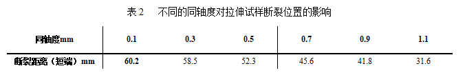 如表2所示,同軸度偏移的值越大,斷裂位置越偏,即短端的長度尺寸越小,當(dāng)同軸度偏移值大到一定程度(0.9mm以上),斷裂位置按照標(biāo)準(zhǔn)規(guī)定,按照無效試驗處理。