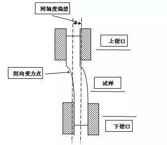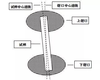 目前多數(shù)拉伸試驗操作過程中,都需要人工進行夾持試樣。人工夾持試樣保證的是試樣前后位置的定位,而兩面的鉗口保證的是試樣左右方向的定位。雖然有許多試驗機配備了對中裝置,但各種標(biāo)準(zhǔn)的試樣選取不同,加工精度也各不相同,對中裝置的實際應(yīng)用有局限性。試樣夾持工作看似簡單,如把握不好仍會對試樣的拉伸產(chǎn)生較大的影響。試樣夾持不對中或傾斜,在進行拉伸試驗時仍然會產(chǎn)生加載與試樣不同軸的現(xiàn)象,試樣承受附加的彎曲應(yīng)力(如圖2),斷裂位置趨向于端部,造成偏移,當(dāng)試樣規(guī)格較小、而試樣傾斜較為嚴(yán)重時,試樣往往會斷裂在鉗口內(nèi),造成斷后伸長率無法測量,這是極限的試驗無效。對試樣夾持位置的判斷,每個操作人員掌握不一,方法也多變,此因素帶有隨機性,不易測量,需要加強方法培訓(xùn),熟練掌握,盡量減少誤差。