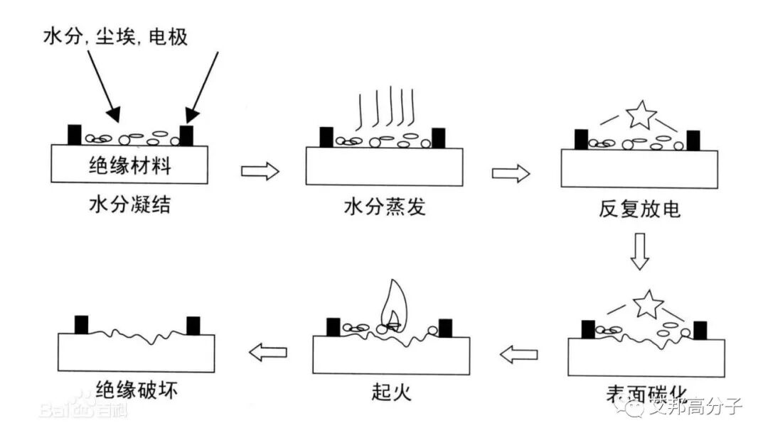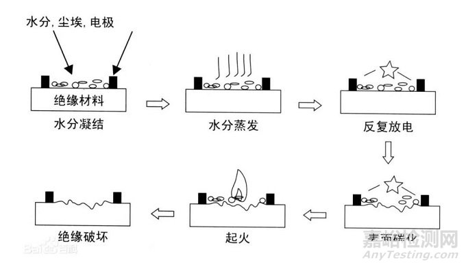 其機(jī)理為:當(dāng)材料表面比較潮濕、有雜物且電場(chǎng)足夠大時(shí),其表面的雜物可能會(huì)通電,通電產(chǎn)生的熱量將水分蒸發(fā),然后形成干燥帶(不含水的導(dǎo)電帶);由于水粉的蒸發(fā)能夠帶走大量熱量,干燥帶不含水,聚集了大量的熱量;足夠多的熱量使絕緣塑料表面碳化,形成碳化導(dǎo)電路,最終形成短路!