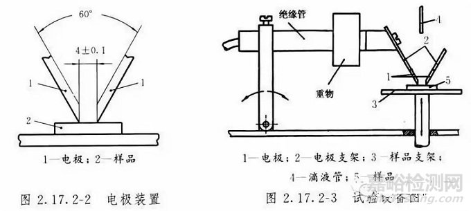 如上圖所示:左圖為電極裝置,右圖為實(shí)驗(yàn)設(shè)備圖。試樣的尺寸應(yīng)大于15mm×15mm,厚度應(yīng)不少于3mm;兩電極之間的距離應(yīng)為4.0 mm 士 0.1mm,夾角為60°;液滴口與樣品的高度應(yīng)在30 -40mm。