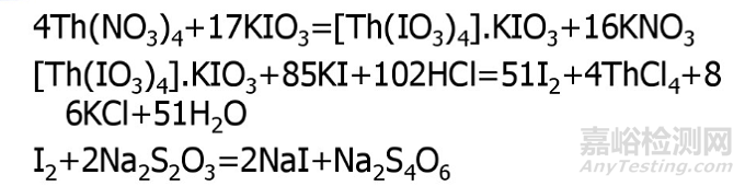 礦樣經(jīng)分解后預先用草酸鹽沉淀分離釷,草酸釷經(jīng)灼燒后再制成溶液,用碘酸鉀沉淀。沉淀溶于鹽酸——碘化鉀溶液中,析出相當于釷的點,用標準硫代硫酸鈉滴定。主要反應如下: