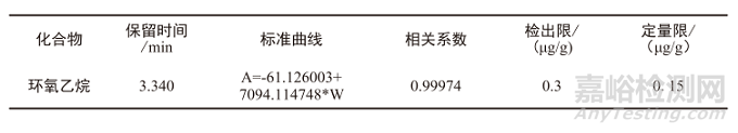 環(huán)氧乙烷的保留時(shí)間、線性方程、相關(guān)系數(shù)及檢出限: